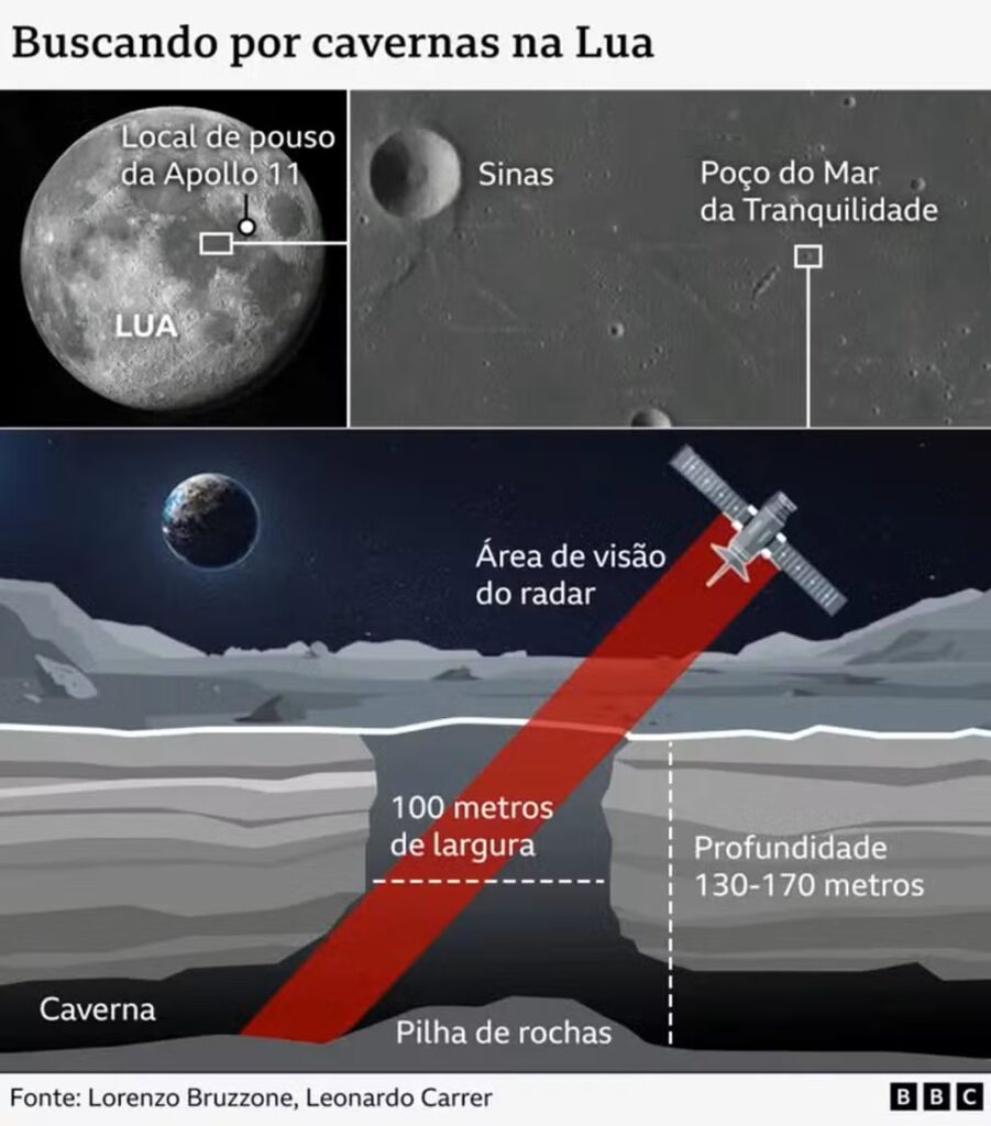 Os pesquisadores Lorenzo Bruzzone e Leonardo Carrer, da Universidade de Trento, na Itália, encontraram a caverna usando um radar que penetrou a abertura do poço numa planície rochosa chamada Mare Tranquillitatis (Mar da tranquilidade).
