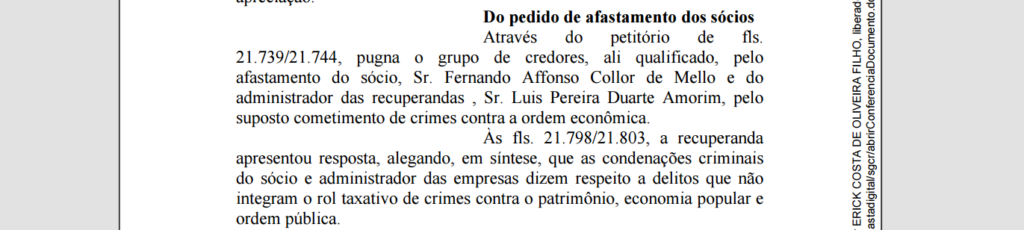 A justificativa do juiz que pode entrar para um dos aspectos pitorescos desse processo cometidos pela Justiça de Alagoas, e outras instâncias onde Collor mantinha influência: nem Collor nem Amorim seriam afastados porque os crimes pelos quais foram condenados – por nada menos que a mais alta corte do país, o STF: corrupção e lavagem de dinheiro – não se enquadravam nos crimes previstos na legislação que trata de recuperação judicial.