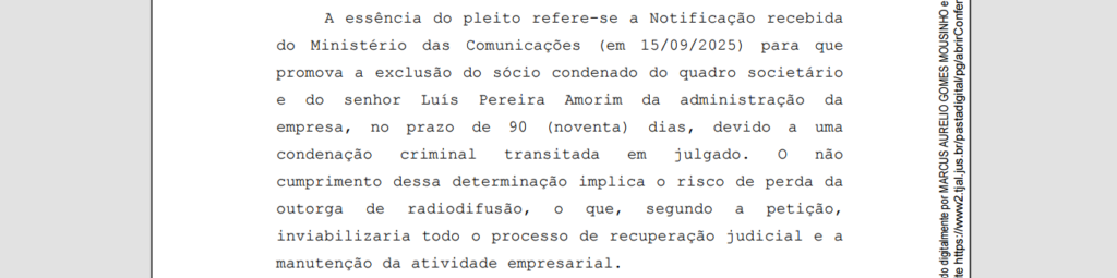 É que, em especial para a condição de Collor – sócio majoritário, mas, assim como Amorim, condenado pelo STF por corrupção e lavagem de dinheiro –, se não houver o afastamento num prazo de 90 dias (três meses), as empresas da OAM que operam emissoras de rádio e televisão perdem a outorga, ou seja: o direito de explorar o serviço, que, no Brasil, é uma concessão pública.