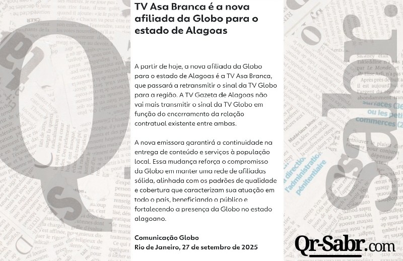 Subscrito pelo setor responsável pela interação com a sociedade, a Comunicação Globo, a nota é taxativa a partir do título: “TV Asa Branca é a nova afiliada da Globo para o estado de Alagoas”.