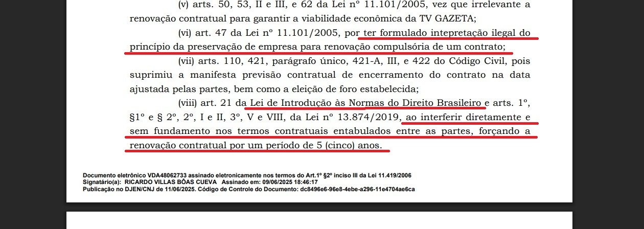 O sexto ponto da argumentação do recurso da Globo diz, textualmente, que houve “intepretação ilegal do princípio da preservação de empresa para renovação compulsória de um contrato”.
