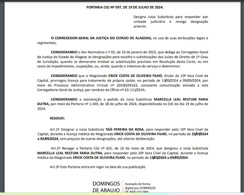 Em maio do passado, a 10ª Vara Cível mudou novamente de comando, e a responsabilidade por responder pela unidade judicial passou às mãos da primeira magistrada, ao longo desse arrastado processo: a juíza de Direito Patrícia Siqueira Curvelo, recém-ingressa na magistratura alagoana, via concurso público.